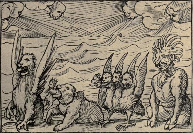 Daniel 7.1-18: In the first year of King Belshazzar of Babylon, Daniel had a dream and visions of his head as he lay in bed. Then he wrote down the dream: (2) I, Daniel, saw in my vision by night the four winds of heaven stirring up the great sea, (3) and four great beasts came up out of the sea, different from one another. (4) The first was like a lion and had eagles’ wings. Then, as I watched, its wings were plucked off, and it was lifted up from the ground and made to stand on two feet like a human being; and a human mind was given to it. (5) Another beast appeared, a second one, that looked like a bear. It was raised up on one side, had three tusks in its mouth among its teeth and was told, “Arise, devour many bodies!” (6) After this, as I watched, another appeared, like a leopard. The beast had four wings of a bird on its back and four heads; and dominion was given to it. (7) After this I saw in the visions by night a fourth beast, terrifying and dreadful and exceedingly strong. It had great iron teeth and was devouring, breaking in pieces, and stamping what was left with its feet. It was different from all the beasts that preceded it, and it had ten horns. (8) I was considering the horns, when another horn appeared, a little one coming up among them; to make room for it, three of the earlier horns were plucked up by the roots. There were eyes like human eyes in this horn, and a mouth speaking arrogantly. (9) As I watched, thrones were set it place, and an Ancient One took his throne, his clothing was white as snow, and the hair of his head like pure wool; his throne was fiery flames, and its wheels were burning fire. (10) A stream of fire issued and flowed out from his presence. A thousand thousands served him, and ten thousand times ten thousand stood attending him. The court sat in judgment, and the books were opened. (11) I watched then because of the noise of the arrogant words that the horn was speaking. And as I watched, the beast was put to death, and its body destroyed and given over to be burned with fire. (12) As for the rest of the beasts, their dominion was taken away, but their lives were prolonged for a season and a time. (13) As I watched in the night visions, I saw one like a human being coming with the clouds of heaven. And he came to the Ancient One and was presented before him. (14) To him was given dominion and glory and kingship, that all peoples, nations, and languages should serve him. His dominion is an everlasting dominion that shall not pass away, and his kingship is one that shall never be destroyed. (15) As for me, Daniel, my spirit was troubled within me, and the visions of my head terrified me. (16) I approached one of the attendants to ask him the truth concerning all this. So he said that he would disclose to me the interpretation of the matter: (17) “As for these four great beasts, four kings shall arise out of the earth. (18) But the holy ones of the Most High shall receive the kingdom and possess the kingdom forever – forever and ever.”