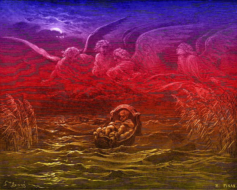 Now a man from the house of Levi went and married a Levite woman. The woman conceived and bore a son; and when she saw that he was a fine baby, she hid him three months. When she could hide him no longer she got a papyrus basket for him, and plastered it with bitumen and pitch; and she put the child in it and placed it among the reeds on the bank of the river. His sister stood at a distance, to see what would happened to him. The daughter of Pharaoh came down to bathe at the river, while her attendants walked beside the river. She saw the basket among the reeds and sent her maid to bring it. When she opened it, she saw the child. He was crying, and she took pity on him. “This must be one of the Hebrews’ children,” she said. Then his sister said to Pharaoh’s daughter, “Shall I go and get a nurse from the Hebrew women to nurse the child for you?” Pharaoh’s daughter said to her, “Yes.” So the girl went and called the child’s mother. Pharaoh’s daughter said to her, “Take this child and nurse it for me, and I will give you your wages.” So the woman took the child and nursed it. When the child grew up, she brought him to Pharaoh’s daughter, and she took him as her son. She named him Moses, “because,” she said, “I drew him out of the water.”